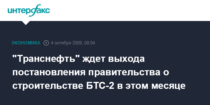 Талакан (Якутия). 4 октября. ИНТЕРФАКС - Компания "Транснефть" ожидает выхода постановления правительства о строительстве второй очереди Балтийской трубопроводной системы (БТС-2) в ближайшие две-три недели, сообщил журналистам глава компании Николай Токарев.