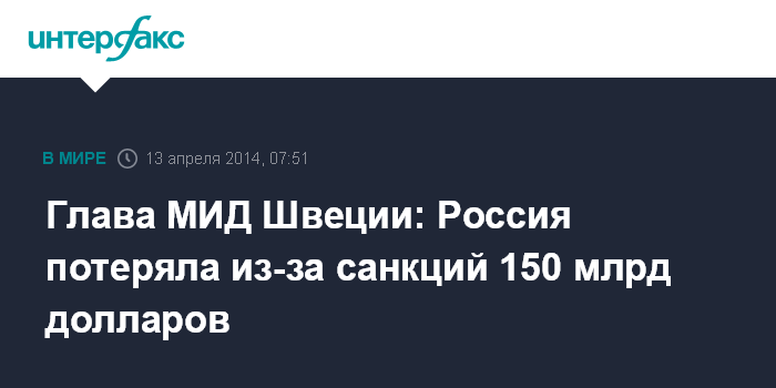 Москва. 13 апреля. INTERFAX.RU - Министр иностранных дел Швеции Карл Бильдт считает, что из-за уже введенных против России санкций в первом квартале она потеряла 150 млрд долларов, передает Би-би-си.