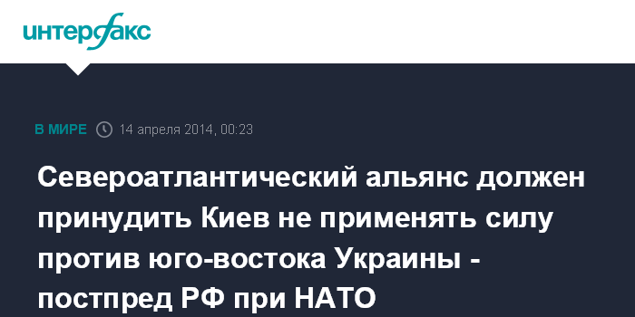 "В качестве первоочередного шага НАТО должна потребовать от властей в Киеве незамедлительно отменить все решения о применении военной силы для подавления протестов жителей юга и востока Украины, вернуть войска в казармы, а также прекратить оказание любой помощи и содействия вооруженным силам и силам безопасности Украины", - сказал он "Интерфаксу" в воскресенье.