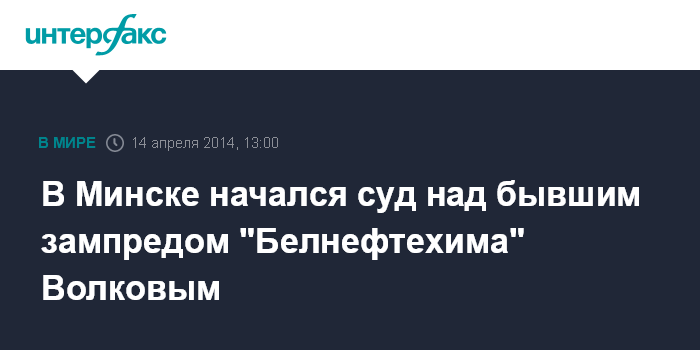 Москва. 14 апреля. INTERFAX.RU - Суд Московского района Минска в понедельник приступил к рассмотрению уголовного дела бывшего заместителя председателя концерна "Белнефтехим" Владимира Волкова, передает корреспондент агентства "Интерфакс-Запад" из зала суда.