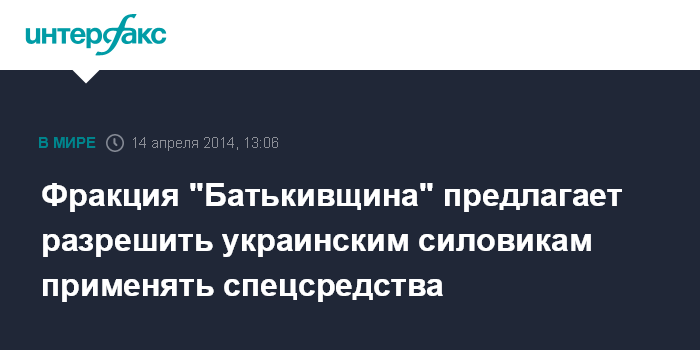 Москва. 14 апреля. INTERFAX.RU - Фракция "Батькивщина" считает необходимым пересмотреть постановления Верховной рады Украины, принятые в феврале текущего года, которые ограничивают право силовиков применять специальные меры и средства в отношении тех, кто с оружием захватывает помещения.
