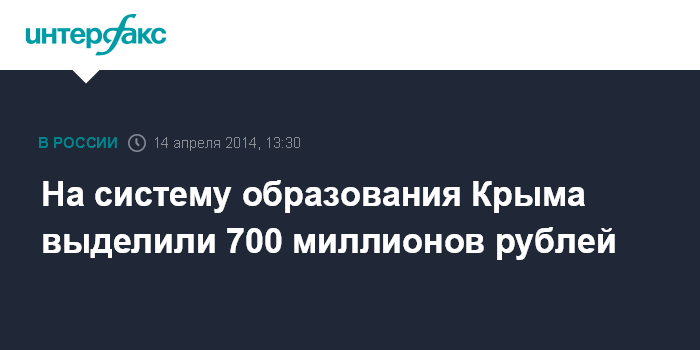 Москва. 14 апреля. INTERFAX.RU - На систему образования Крыма и Севастополя будет выделено около 700 млн рублей, сообщил глава министерства образования и науки Дмитрий Ливанов.