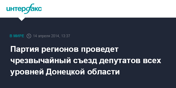 Москва. 14 апреля. INTERFAX.RU - Партия регионов намерена провести 16 апреля чрезвычайный съезд депутатов всех уровней Донецкой области в связи с последними событиями в регионе.