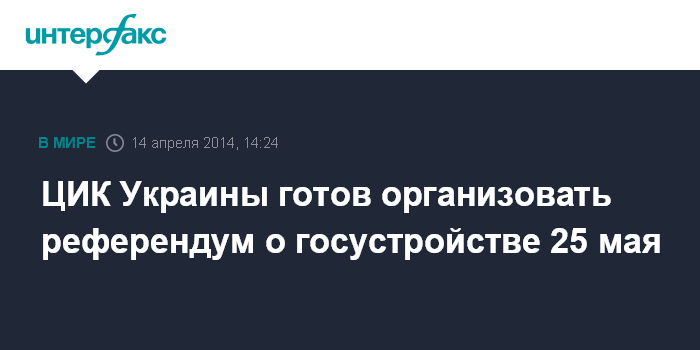 "Центральная избирательная комиссия в случае назначения всеукраинского референдума на 25 мая готова подготовить проведение такого референдума при наличии соответствующей законодательной базы", - заявил председатель ЦИК Михаил Охендовский в комментарии "Интерфаксу".