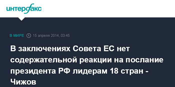 В заключениях Совета ЕС нет содержательной реакции на послание президента РФ лидерам 18 стран - Чижов