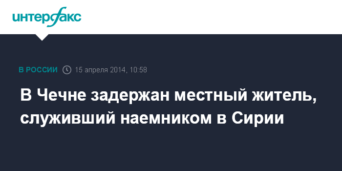 Он сообщил, что накануне в селе Гехи Урус-Мартанского района Чечни был задержан местный житель, подозреваемый в наемничестве. По данным силовиков, с весны и до окончания 2013 года мужчина воевал на стороне сирийской оппозиции. Ему грозит уголовное преследование по статье 359 УК РФ (наемничество) и лишение свободы на срок до семи лет.
