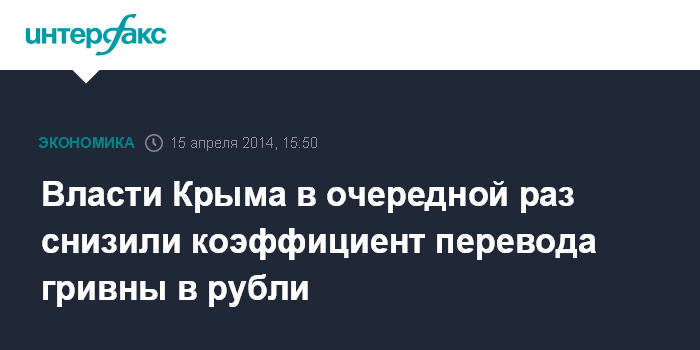 Москва. 15 апреля. INTERFAX.RU - Совет министров Крыма своим постановлением снизил коэффициент пересчета цен и тарифов с украинской гривны на российский рубль с 3,1 до 2,8.
