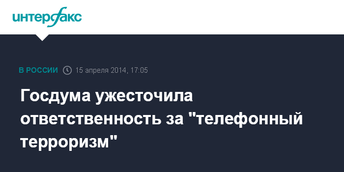 Москва. 15 апреля. INTERFAX.RU - Госдума во вторник приняла в третьем чтении закон об ответственности за заведомо ложное сообщение о теракте, которое привело к крупному ущербу или другим тяжким последствиям.