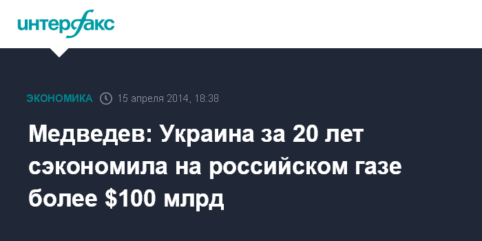 Москва. 15 апреля. INTERFAX.RU - Украина сэкономила на скидках на газ более $100 млрд за два десятилетия, заявил премьер-министр РФ Дмитрий Медведев на пресс-конференции по окончании встречи с премьерами Белоруссии и Казахстана во вторник в Москве.