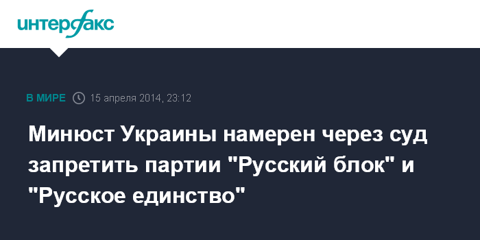 Москва. 15 апреля. INTERFAX.RU - Министерство юстиции Украины подало иск в суд по поводу запрета деятельности партий "Русский блок" и "Русское единство", сообщил глава ведомства Павел Петренко.