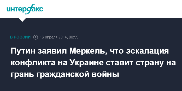 Москва. 16 апреля. ИНТЕРФАКС - Президент РФ Владимир Путин отметил в разговоре с канцлером ФРГ Ангелой Меркель, что резкая эскалация конфликта на Украине ставит страну на грань гражданской войны.