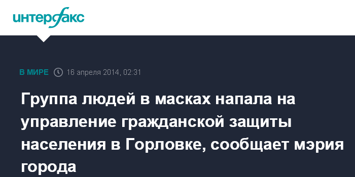 Киев. 16 апреля. ИНТЕРФАКС-УКРАИНА - Во вторник после 21.00 на здание, в котором расположено управление гражданской защиты населения городского совета Горловки (Донецкая область) было совершено нападение, сообщает пресс-служба мэрии города.