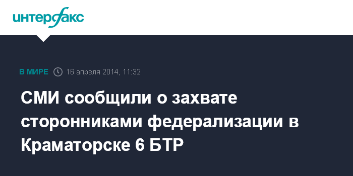 Киев. 16 апреля. INTERFAX.RU - Сторонники федерализации Украины завладели шестью бронетранспортерами, которые участвовали в силовой операции в Краматорске, сообщил в среду донецкий портал "ОстроВ" со ссылкой на своего корреспондента в городе.
