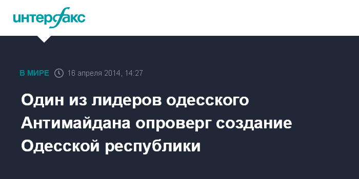 Москва. 16 апреля. INTERFAX.RU - Создание Одесской республики - это дезинформация или провокация, заявил агентству "Интерфакс-Украина" один из лидеров одесского Антимайдана, брат арестованного Антона Давидченко Артем.