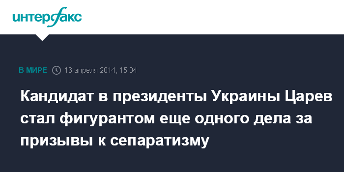 Киев. 16 апреля. INTERFAX.RU - Прокуратура Киева открыла еще одно уголовное производство в отношении народного депутата (фракция Партии регионов), кандидата в президенты Украины Олега Царева за призывы к сепаратизму.