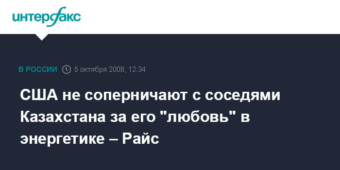 "Экономические и политические отношения с Казахстаном основаны на принципах транспарентности. И из этой встречи (с главой МИД Казахстана Маратом Тажиным. - "ИФ-К") нужно сделать вывод, что мы (США) не конкурируем и не соревнуемся с другими странами за любовь Казахстана (в энергетической сфере). У Казахстана отличные отношения с соседями, так и должно быть", - сказала К.Райс, отвечая на соответствующий вопрос журналистов, на пресс-брифинге в Астане в воскресенье после переговоров с главой внешнеполитического ведомства республики.