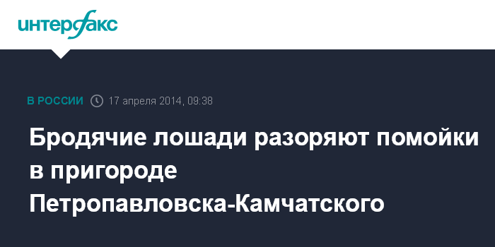 Москва. 17 апреля. INTERFAX.RU - Гендиректор организации по сбору и вывозу бытовых отходов в поселке Заозерный (пригород Петропавловска-Камчатского) Борис Бузик пожаловался в городскую администрацию на лошадей, разгуливающих по поселку и разоряющих местные помойки.