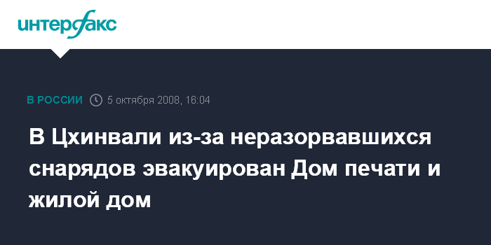Цхинвали. 5 октября. INTERFAX.RU - Сотрудниками Спецстроя России в воскресенье на крыше Дома печати в Цхинвали, в котором находится международный пресс-центр и редакции государственных изданий, обнаружен неразорвавшийся снаряд.