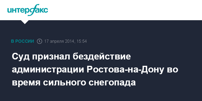 "Бездействие администрации Ростова-на-Дону по решению вопросов в сфере дорожной деятельности и обеспечения безопасности дорожного движения, а также организации уборки снега и устранения скользкости на дорогах города с 27.01.2014 по 31.01.2014 признано незаконным", - сказал собеседник агентства.