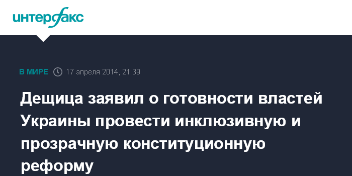 Женева. 17 апреля. INTERFAX.RU - Глава МИД Украины Андрей Дещица заявил о том, что Киев готов провести в стране инклюзивную и прозрачную конституционную реформу, сказал в четверг госсекретарь США Джон Керри.