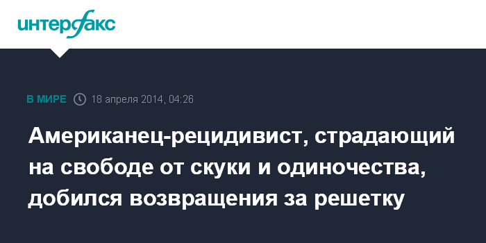 Лондон. 18 апреля. INTERFAX.RU - Американец, который провел большую часть своей жизни за решеткой, в четверг получил очередной тюремный срок, которого он нарочно добивался.