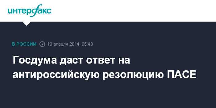 В проекте говорится, что Госдума "выражает категорическое несогласие с практикой двойных стандартов и дискриминацией России", выразившихся в принятии 10 апреля 2014 года Парламентской ассамблеей Совета Европы (ПАСЕ) резолюции "Пересмотр по существенным основаниям ранее утвержденных полномочий российской делегации".