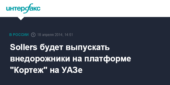 Москва. 18 апреля. INTERFAX.RU -Москва. 18 апреля. ИНТЕРФАКС - Компания Sollers будет выпускать внедорожники на платформе "Кортеж" на Ульяновском автомобильном заводе (УАЗ).