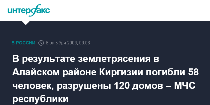 Бишкек. 6 октября. INTERFAX.RU - 58 человек погибли во время землетрясения в Алайском районе Киргизии, еще 50 получили ранения, сообщили "Интерфаксу" в МЧС республики в понедельник.