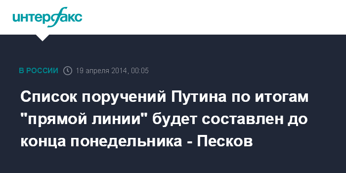 "Некоторые поручения были им (В.Путиным) даны буквально в течение часа после завершения "прямой линии", а по всему комплексу вопросов, которые затрагивались в предметном плане, до конца понедельника будет формулироваться список поручений президента", - сообщил Д.Песков в эфире программы "Воскресный вечер с Владимиром Соловьевым".