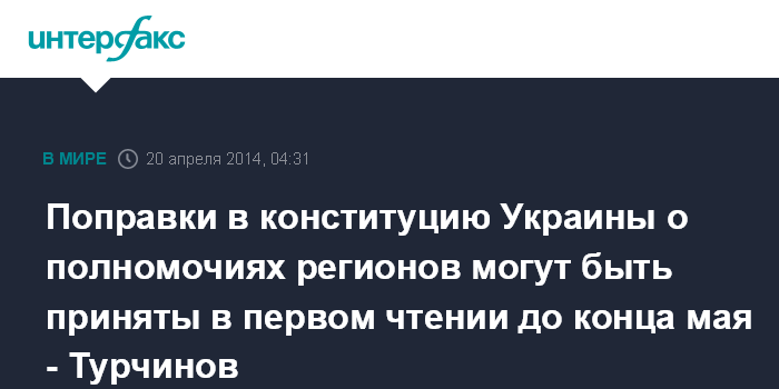 Киев. 20 апреля. ИНТЕРФАКС-УКРАИНА - Председатель Верховной Рады Украины, и.о. главы государства Александр Турчинов надеется на скорое принятие поправок в конституцию, касающихся расширения полномочий регионов, сообщает пресс-служба украинского парламента.
