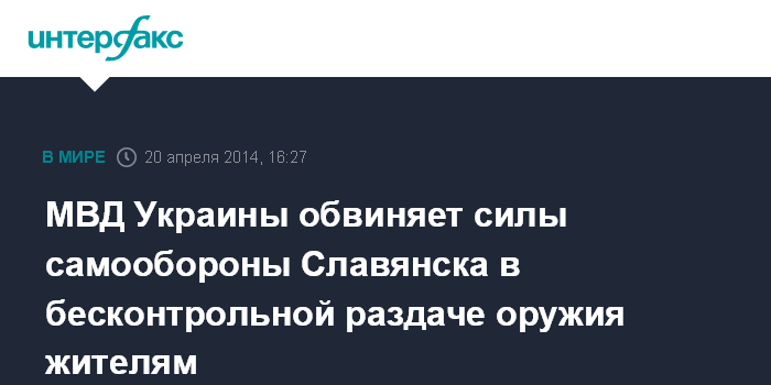 Москва. 20 апреля. INTERFAX.RU - В министерстве внутренних дел Украины заявляют, что после того, как так называемые "силы самообороны Славянска" захватили горотдел милиции, местным жителям, в том числе и имевшим в прошлом проблемы с законом, было выдано оружие, что и приводит к травмам и жертвам.