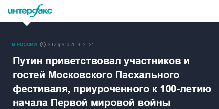 Путин приветствовал участников и гостей Московского Пасхального фестиваля, приуроченного к 100-летию начала Первой мировой войны