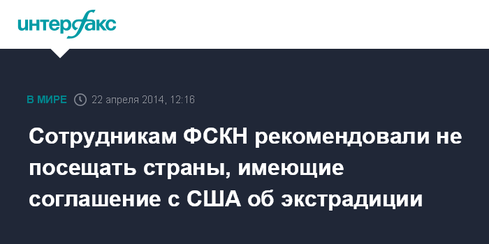 Москва. 22 апреля. INTERFAX.RU - Сотрудникам Федеральной службы РФ по наркоконтролю рекомендовали не ездить в страны, у которых есть соглашение с США об экстрадиции.