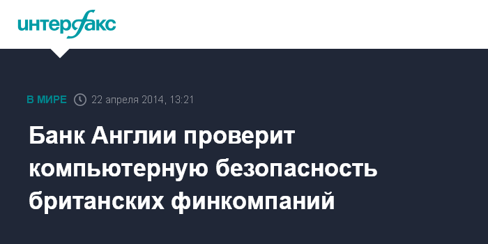 Москва. 22 апреля. INTERFAX.RU - Банк Англии в 2014 году проведет проверку систем компьютерной безопасности более 20 крупнейших банков и финансовых компаний Великобритании, пишет газета Financial Times со ссылкой на информированные источники.