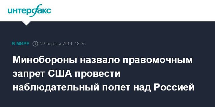 Москва. 22 апреля. INTERFAX.RU - Российское военное ведомство во вторник прокомментировало ситуацию относительно якобы неправомочного запрета со стороны РФ наблюдательного полета самолета США над Россией, сроки которого неоднократно менялись.