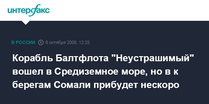 Москва. 6 октября. INTERFAX.RU - Сторожевой корабль Балтийского флота (БФ) "Hеустрашимый" прошел Гибралтарский пролив и находится сейчас в Средиземном море, однако к берегам Сомали прибудет нескоро, сообщили "Интерфаксу" в понедельник в штабе БФ.