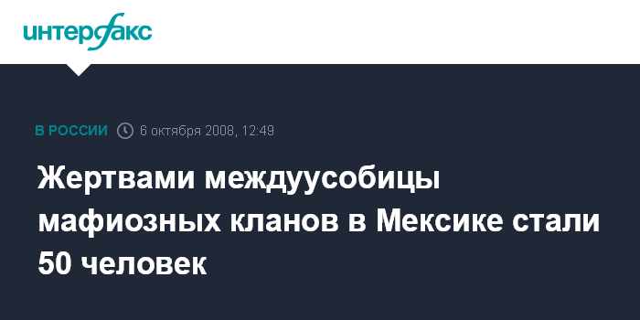 Москва. 6 октября. INTERFAX.RU - До 50 человек увеличилось за последние семь дней количество погибших в результате наркотических мафиозных войн в Мексике, сообщает в понедельник британская газета "Таймс".