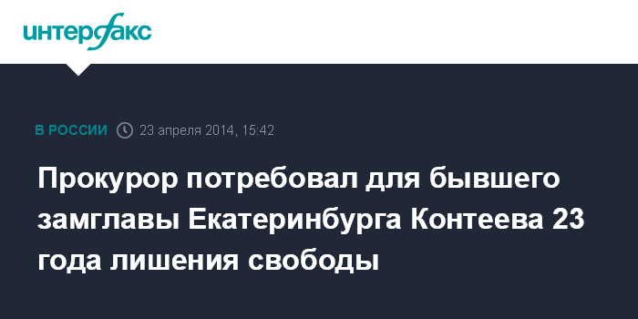 Москва. 23 апреля. INTERFAX.RU - Гособвинитель попросил приговорить бывшего вице-мэра Екатеринбурга Виктора Контеева, обвиняемого в причастности к убийствам, к 23 годам лишения свободы и штрафу в 500 млн рублей, сообщила агентству "Интерфакс" помощник Контеева Илона Стародубцева.