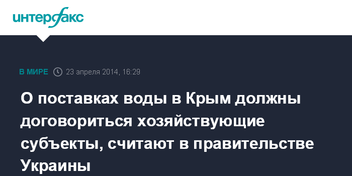 В Государственном агентстве водных ресурсов Украины ранее сообщили, что увеличению подачи воды в Крым до запланированных в 2014 году объемов препятствует отсутствие договора о предоставлении услуг водоснабжения между уполномоченным от полуострова лицом и Управлением Северо-Крымского канала. Проект соответствующего договора поступил в Управление Северо-Крымского канала от Красноперекопского межрайонного управления водного хозяйства лишь 15 апреля 2014 года.