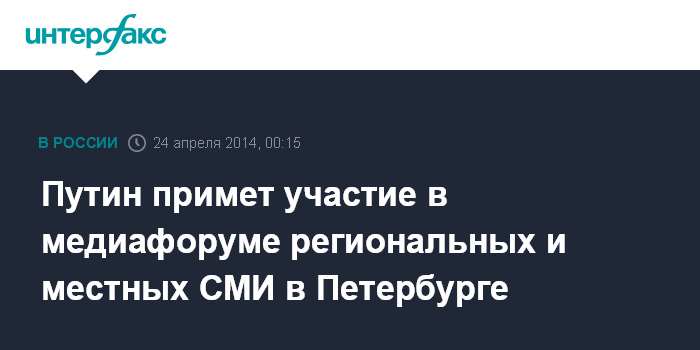 Москва. 24 апреля. INTERFAX.RU - Президент РФ Владимир Путин в четверг примет участие в пленарном заседании первого медиафорума региональных и местных СМИ, организованного Общероссийским народным фронтом в Санкт-Петербурге, сообщает пресс-служба Кремля.