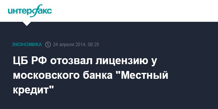 ЦБ РФ отозвал лицензию у московского банка "Местный кредит"
