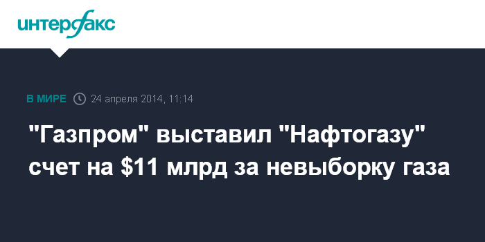 Москва. 24 апреля. INTERFAX.RU - "Газпром" в среду выставил "Нафтогазу Украины" счет за невыборку газа по условию "бери или плати" (take-or-pay) в 2013 году в размере $11,388 млрд, сообщил журналистам зампред правления "Газпрома" Александр Медведев.