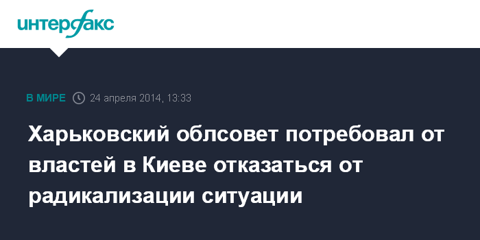 Москва. 24 апреля. INTERFAX.RU - Харьковский областной совет обратился к Верховной Раде Украины с требованием искать консенсус в обществе исключительно путем переговоров.