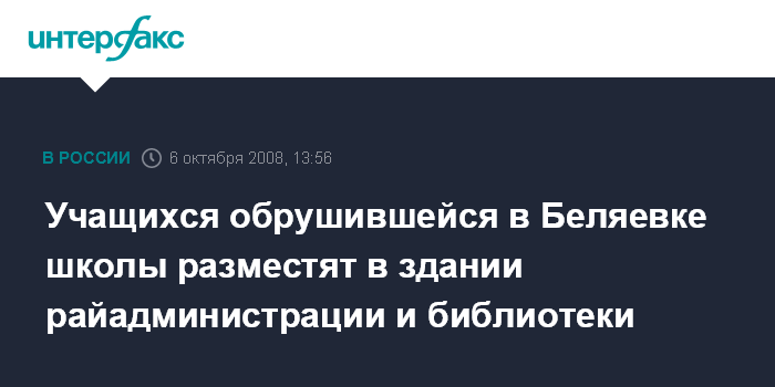 Москва. 6 октября. INTERFAX.RU - Ученики 6-11 классов обрушившейся школы в поселке Беляевка Оренбургской области будут учиться не в школе соседнего села Днепровка, как предполагалось ранее, а в здании районной администрации.