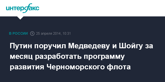 Москва. 25 апреля. INTERFAX.RU - Президент РФ Владимир Путин поручил правительству совместно с Минобороны разработать программу развития Черноморского флота, сообщила пресс-служба главы государства.