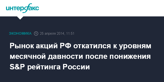 Москва. 25 апреля. INTERFAX.RU - Рынок акций РФ откатился к уровням месячной давности после понижения S&P рейтинга России и данных EPFR.