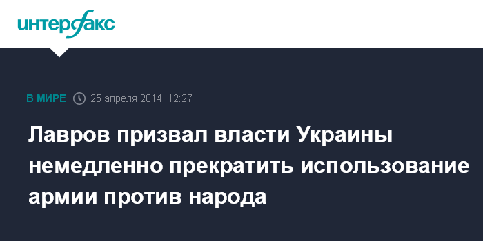 Москва. 25 апреля. INTERFAX.RU - Прекращение использования украинской армии против собственного народа - важнейший шаг к стабилизации ситуации на юго-востоке Украины, считает глава МИД России Сергей Лавров.