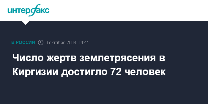 Москва. 6 октября. INTERFAX.RU - По предварительным данным, количество погибших в результате землетрясения жителей села Нура на юге Киргизии увеличилось до 72 человек, сообщила в понедельник "Интерфаксу" пресс-секретарь министерства здравоохранения страны Елена Баялинова. Она сказала, что число пострадавших также возросло, и составляет 100 человек.