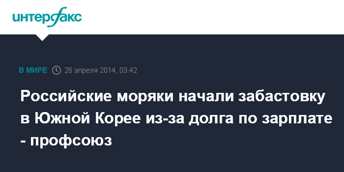 Москва. 26 апреля. INTERFAX.RU - Экипаж теплохода "President" (флаг Белиза) заявил протест против задолженности по заработной плате и остановил грузовые операции на судне в порту Инчхон (Южная Корея), сообщает Российский профсоюз моряков.