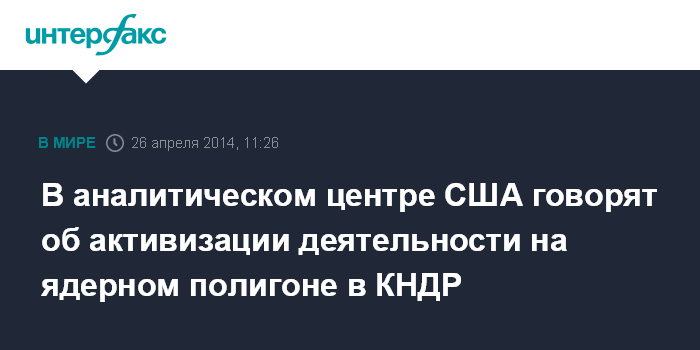 Москва. 26 апреля. INTERFAX.RU - Новые фотографии со спутников свидетельствуют, что Пхеньян может провести подземные ядерные испытания в ближайшие дни, говорится в заявлении американского Института проблем науки и международной безопасности (англ. ISIS). "Никогда нельзя сказать с определенностью о планах КНДР. Поэтому, проведение испытания в ближайшие несколько дней нельзя исключать", - отмечает ISIS.